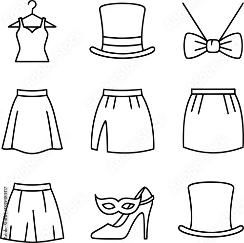 fashion, clothing, apparel, accessory, icon, vector, outline, line art, garment, skirt, top, hat, bow tie, shoe, mask, hanger, style, clothes rack, design, graphic, collection, set, drawing, illustration, costume, attire, outfit, glamour, elegance, masquerade