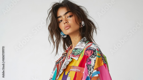 fashion model, clothing, woman, beauty, fashion, make-up, female, print, textile, collection, colourful, confident, creative, design, elegance, expression, coiffure, minimal, mixed, model, patchwork, people, stylish, trendy, vibrant, white background, youth