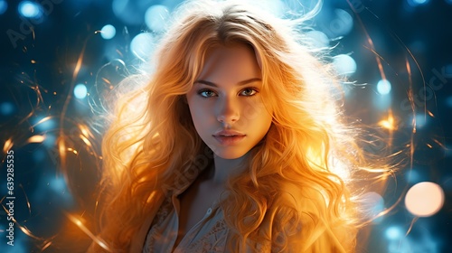 woman, hair, portrait, creative, light, effect, backlight, model, girl, blue, lighting, bright, beauty, fashion, glamour, art, face, fantastic, shine, radiance, make-up, coiffure, red, yellow, style, lip, vintage, eye, lady, studio, leather, feminine, retro, people, elegance, colourful