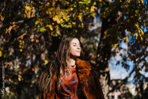 1, people, adult, woman, outdoors, day, spain, highlight, standing, sunlight, closed, eye, leisure, fur coat, cold, mid, adult, female, blond, fashion, caucasian, fashionable, lifestyle, warm clothes, park, alone