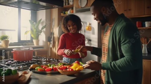 father, daughter, kitchen, cooking, vegetable, smiling, preparing, family, home, love, happy, food, fun, together, human relationships, joy, lifestyle, meal, dinner, healthy, fresh, green, red, yellow, orange, brown, white, wooden, window, light, sun, pot, stove, countertop, chopping, knife, cutting