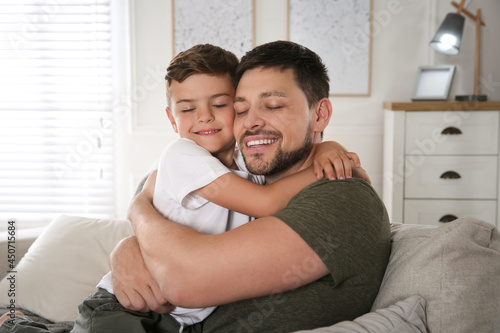 Father and his son on sofa in living room. Adoption concept