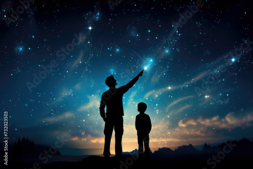 Father and son in silhouette looking up at Milky Way sky. Enigmatic stargazer beneath the cosmic canopy, lost in celestial contemplation.