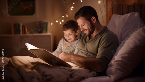 Father and son reading a bedtime story in cozy bedroom with string lights and bookshelf in warm evening light