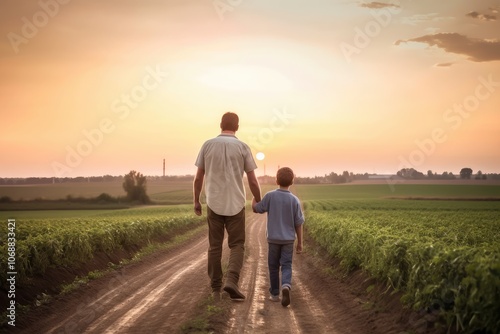 father, son, sunset, walking, farm, dirt road, bonding, family, field, countryside, togetherness, parenting, nature, rural, landscape, outdoors, golden hour, agriculture, generation, backview, holding hands, horizon, serene, peaceful, evening, warm light, connection, path, tree, sky, calm, together, journey, love, human relationships