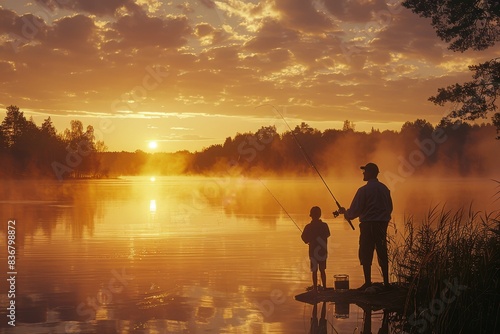 Father and teenage son fishing at a peaceful lakeside during sunrise