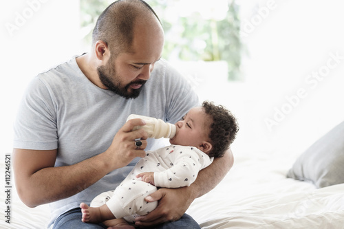 affection, african ethnicity, asian, home, authenticity, baby, baby boy, bed, bedchamber, bottle, candid, caring, casual attire, childhood, closeup, color image, day, domestic life, eating, father, feeding, food and drink, happiness, innocence, laying, leisure, lifestyle, love, man, milk, new jersey, nourishing, nurturing, nourishment, parenting, people, real people, serious, son, two people