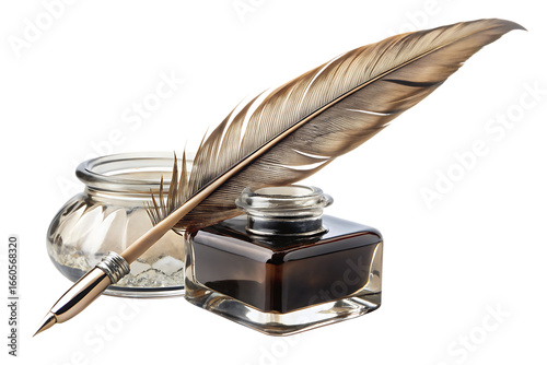 Feather Quill Pen and Inkwell with White Powder on White Background writing isolated on a transparent background