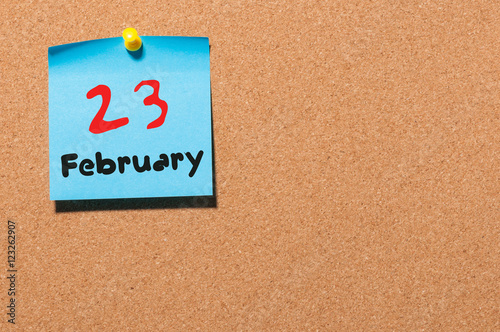 February 23rd. Day 23 of month, calendar on cork notice board background. Winter time. Empty space for text
