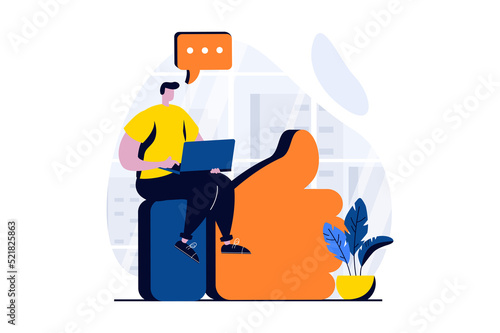 Feedback page concept with people scene in flat cartoon design. Man leaves like and comment with his experience and recommendations. Customer satisfaction. Illustration visual story for web
