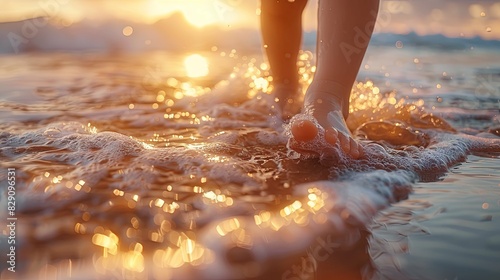 Feet walking in the surf at sunset, ideal for content on relaxation, summer vacations, and coastal living.