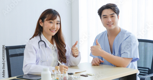 Female doctor and young male patient while consult and .explain. Doctor and patient sitting together at table in examination room.