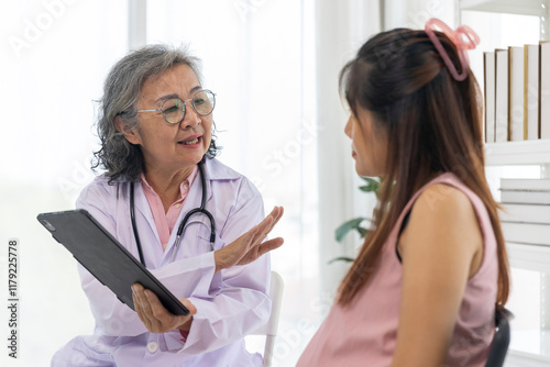 Female Doctor use digital tablet for Consulting with Pregnant Woman