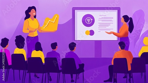 female, engineer, presenting, idea, diverse, audience, chart, technology, innovation, empowerment, business, people, silhouette, meeting, woman, sitting, chair, businessperson, businessman, conference, table, team, computer, communication, job, office, illustration, vector, teamwork, group, discussion, interview