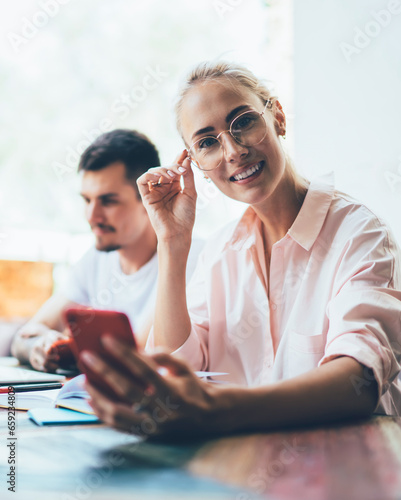 Female freelancer with phone looking at camera