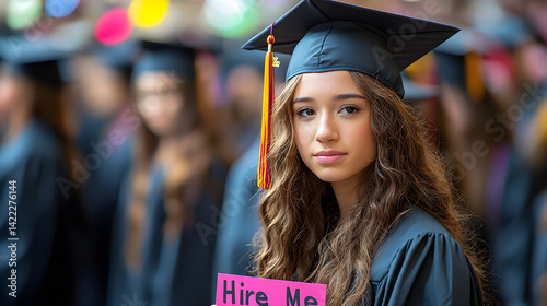 Female graduate in cap and gown holding a "Hire Me" sign, representing unemployment struggles among young professionals