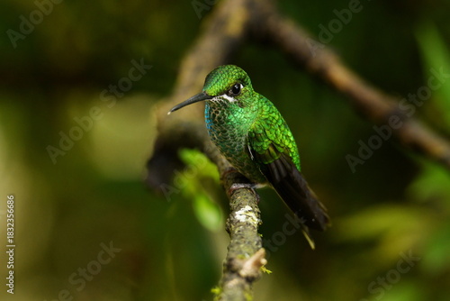 Female Green-crowned brilliant (Heliodoxa jacula jamersoni) perched on a branch at Buenaventura Reserve, El Oro province, Ecuador