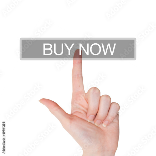 Female hand pushing on a buy now sign