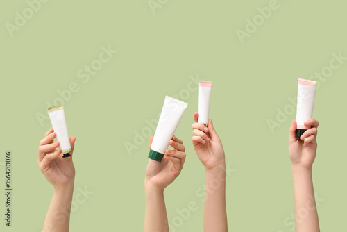 Female hands with tubes of cosmetic cream on green background