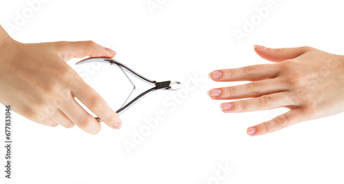 Female hands with tweezers cut cuticle.