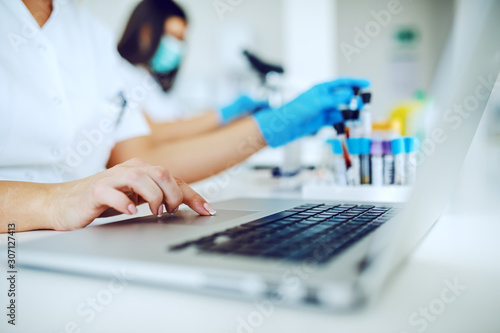 Female lab assistant using laptop for data entry and in other hand holding test tube with blood sample while sitting in laboratory.