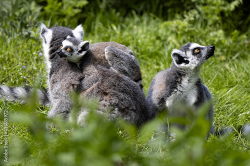 Female Ring-tailed Lemur, Lemur catta, with cubs sitting on a green lawn