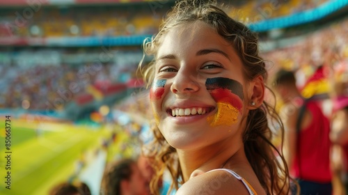 person, 2024, audience, celebrate, championship, cheer, cheering, competition, event, excitement, fan, football, game, generated, horizontal, image, international, smile, soccer, spectator, stadium, success, support, team, ai, ball, euro, happiness, smiling, spanish, sport, copy, face, female, fun, happy, illustration, space, woman, adult, celebration, cheerful, europa, background, german, make-up, mask, paint, flag