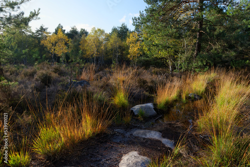 Ferns and sandstone rocks in Apremont gorges. Fontainebleau forest in autumn season