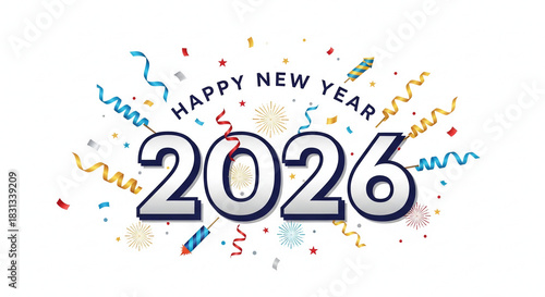 2026, new year, vector, illustration, holiday, celebration, festive, confetti, streamer, party, greeting card, event, promotion, design, graphic, typography, number, date, future, year, happy, joy, excitement, sparkle, glistering, colourful, vibrant, bright, decorative, ornament, anniversary, beginning, calendar, coming, december, jan, season, seasonal, winter, background, element, isolated, white, card, invitation