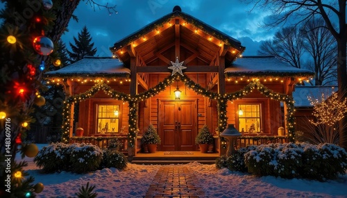 Festive Bethlehem Christmas decorations adorn a building Stars, nativity scene elements, and traditional ornaments create a joyous atmosphere , biblical, religious