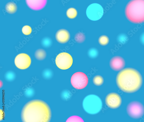 Festive blurred bokeh lights. Abstract blue background with bright yellow gold, pink and turquoise flashlights. Illuminated random circles. Burst of holiday light. Glowing colorful blur. Daylight.