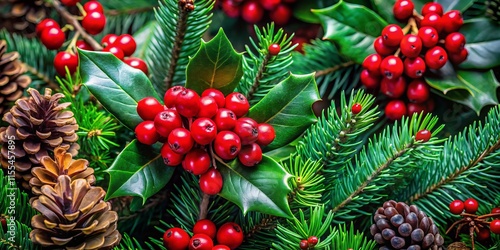 Festive Botanical Background: Holly, Berries, Pine, Winter, Christmas, Holiday, Wreath, Garland, Decoration, Nature, Plants, Floral, Medium Shot