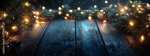 christmas, winter, holiday, festive, background, light, wood, table, pine, branch, snow, decoration, celebration, season, new, year, eve, night, dark, glow, sparkle, magical, cosy, rustic, texture, design, element, scene, image, photo, template, concept, abstract, overlay, effect, glistering, shine, ambience, atmosphere