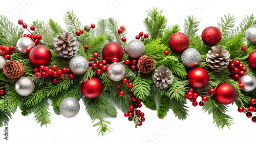 christmas, border, decoration, ornament, pine, tree branch, cone, berry, red, silver, ball, fir, evergreen, holiday, winter, season, festive, celebration, new, year, advent, plant, needle, leaf, spruce, detail, closeup, arrangement, traditional, decorative, element, design, table, centrepiece, nobody, horizontal, copy, space, studio, shot, macro, style, elegant, shiny, glistering, transparent, isolated, alpha