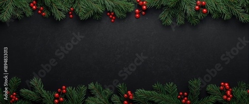 Festive Christmas holiday backdrop with ample space for advertising text, adorned with fir branches and holly berries on black