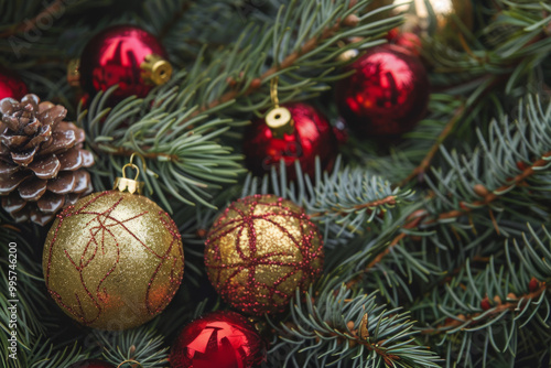 christmas, ornament, red, gold, evergreen, pine, festive, holiday, decoration, bauble, cone, winter, celebration, nature, traditional, shiny, glistering, seasonal, greenery, closeup, background, texture, bright, cheerful, decorative, christmas, new, year, joy, warmth, family, gathering, cosy, rustic, natural, season, spirit, gift, sparkle, colourful, arrangement, decor, wonderland, cheer, beauty, tree