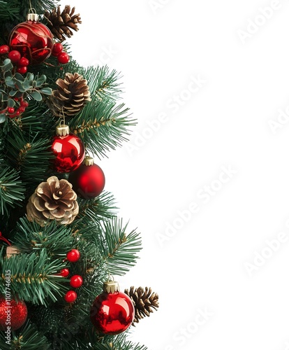 Festive Christmas Pine Garland Border with Pinecones, Red Berries, and Golden Accents on White Background - Perfect for Holiday Designs and Seasonal Celebrations