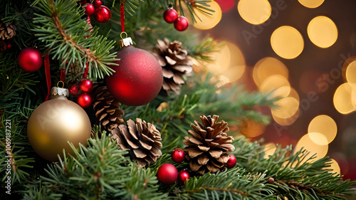 Festive Christmas Tree Close-Up with Red and Gold Baubles and Bokeh Lights