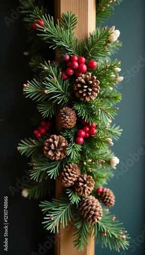 Festive garland with pinecones and holly berries wrapped around a wooden post, dried flowers, evergreen branches