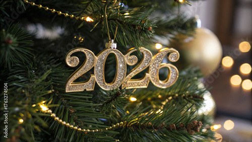 Festive golden 2026 ornament hanging on a Christmas tree with twinkling lights in a cozy setting