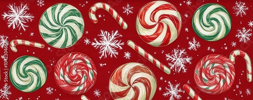 christmas, holiday, festive, candy, lollipop, candy cane, red background, snowflake, seasonal, celebration, winter, sweet, swirl, green, white, pattern, happy, decorative, background, vibrant, traditional, joyful, happy holiday, artistic, creative, playful, merry, winter holiday, festivity, colourful, design, cheer, joy, illustration, bright, fun, wintery, joyous, sweetness, holiday spirit, festive, warmth, graphic