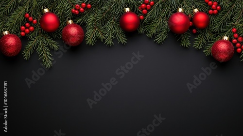Festive holiday decoration featuring red ornaments and greenery against a dark background, perfect for Christmas themes.