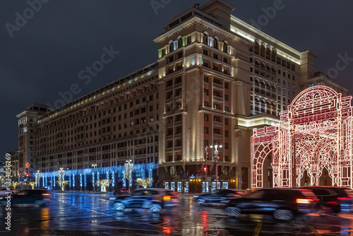 Festive illumination on Christmas night. Cars drive through the streets of the night city. The streets of Moscow on New Year's Eve. The historic building is illuminated on New Year's Eve.