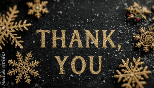 thank, you, gold, black, snowflake, decoration, festive, holiday, season, christmas, winter, greeting, message, celebration, design, texture, background, glistering, sparkle, elegant, graceful, appreciation, generosity, gratitude, kindness, warmth, sentiment, thoughtfulness, love, giving, sharing, joy, happiness, cheer, beautiful, decorative, pattern, craft, ornament, embellishment, handwritten, typography, calligraphy, lettering, detail, macro, closeup, style