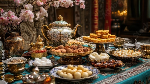 Festive Nowruz Table with Elegant Haft-Seen Display, Persian Sweets, Teapot, and Golden Cutlery