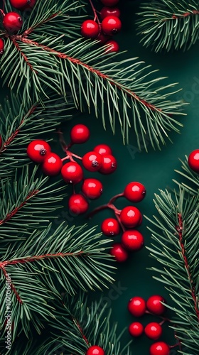 Festive Red Berries and Green Pine Branches