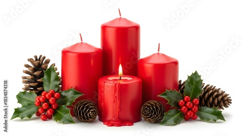 Festive red candles and pine cones isolated on white background, creating a warm and inviting holiday atmosphere.