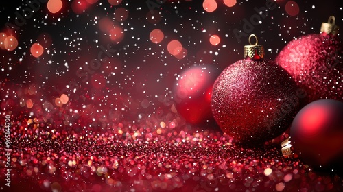 Festive red Christmas ornaments surrounded by sparkling glitter on a dark background during the holiday season