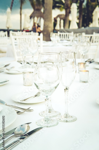 Festive serving with glasses for an outdoor celebration with garland lamps and palms at the background. Wedding, anniversary, birthday dinner and party. Toned image with place for text