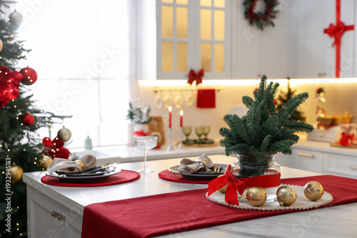 apartment, background, ball, beautiful, branch, celebration, christmas, closeup, copy, december, decor, decoration, design, dinner, crockery, elegant, eve, fashion, festive, fir, furniture, happy, holiday, home, house, indoor, interior, joy, kitchen, merry, new, object, ornament, red, room, season, serving, setting, space, stylish, table, tableware, text, tree, trendy, white, winter, chaplet, christmas